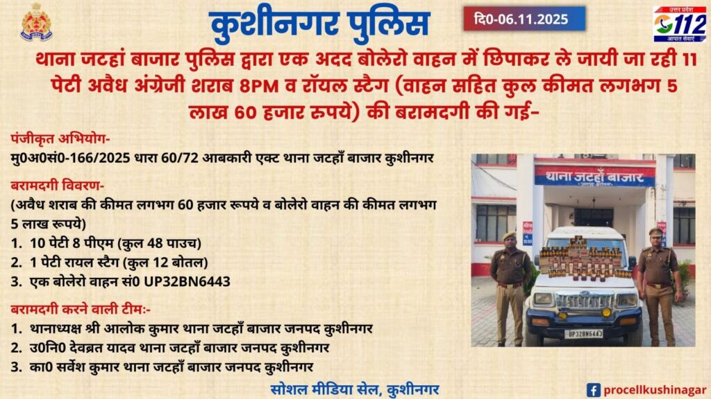 कुशीनगर: जटहां बाजार पुलिस की बड़ी कार्रवाई, बोलेरो से अवैध अंग्रेजी शराब की खेप बरामद, तस्करों पर शिकंजा कसने की तैयारी।
