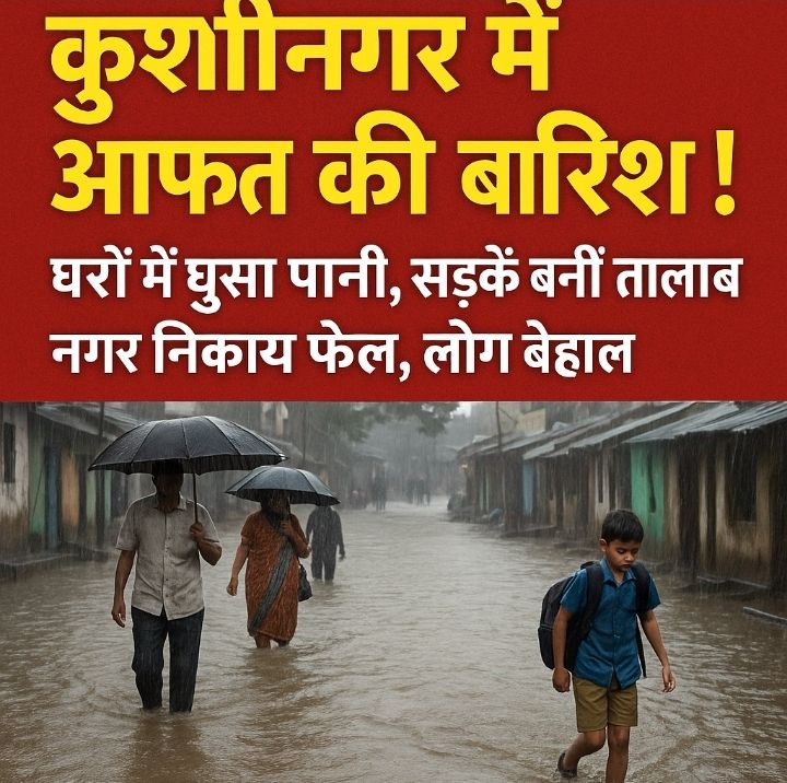 कुशीनगर जिले में लगातार हो रही बारिश ने आम जनजीवन को पूरी तरह अस्त-व्यस्त कर दिया है। बीते तीन दिनों से रुक-रुक कर हो रही मूसलाधार बारिश से जिले के विभिन्न हिस्सों में जलभराव की स्थिति उत्पन्न हो गई है। सड़कों पर पानी भरा हुआ है, गलियां तालाब में तब्दील हो चुकी हैं, और निचले इलाकों में घरों में पानी घुस गया है।