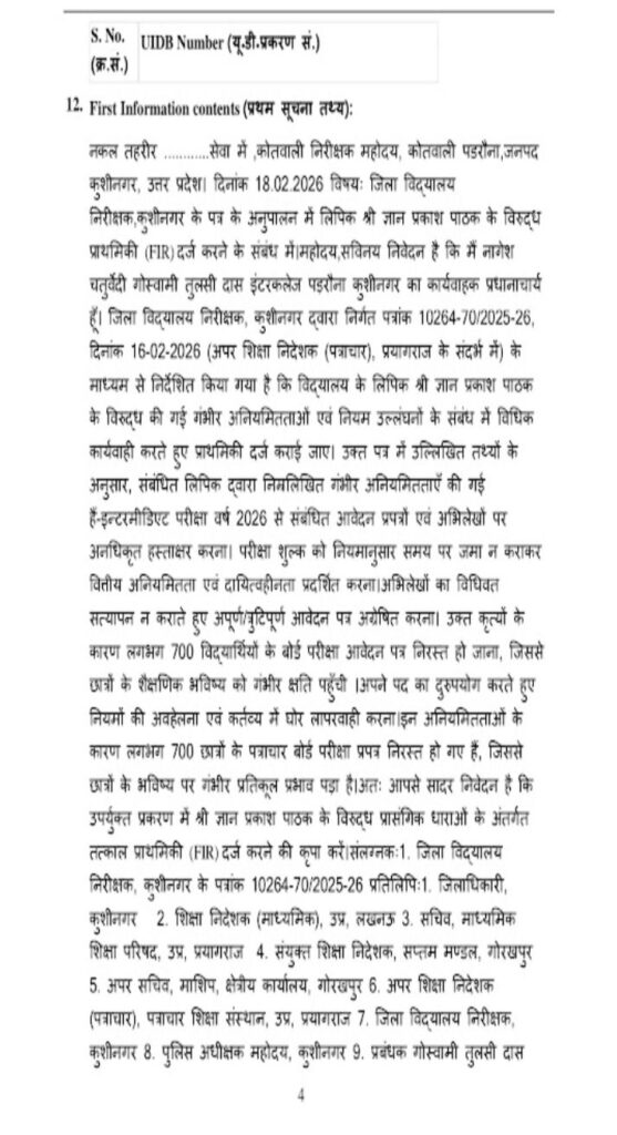 पत्राचार शिक्षा संस्थान, प्रयागराज के अपर शिक्षा निदेशक द्वारा जारी निर्देश में नोडल अधिकारी और प्रधान लिपिक — दोनों के विरुद्ध उत्तर प्रदेश सार्वजनिक परीक्षा (अनुचित साधनों का निवारण) अधिनियम-2024 के तहत मुकदमा दर्ज कराने की बात कही गई थी।