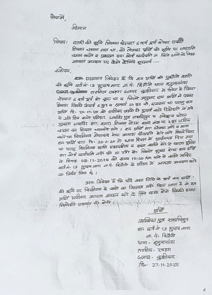 कुशीनगर : “छितौनी में प्रशासन कुंभकर्णी नींद में! पीड़ित अम्बिका कुशवाहा चार दिन से आमरण अनशन पर, फिर भी नहीं पहुंचे अधिकारी”।