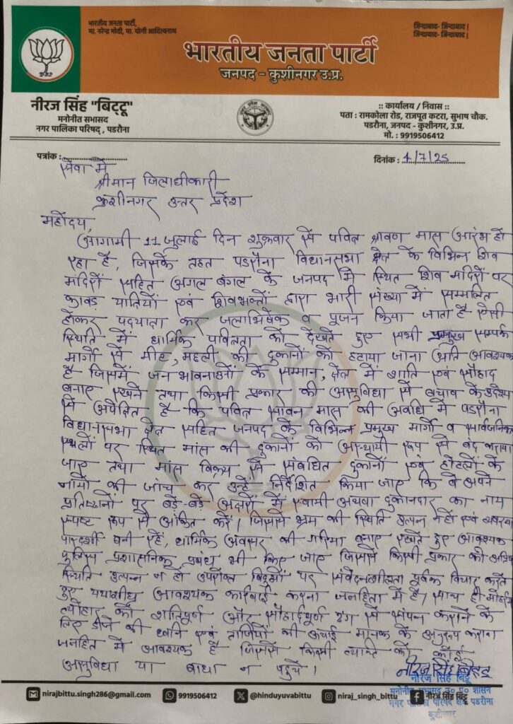 पडरौना :- पडरौना नगर निवासी, समाज सेवी एवं मनोनीत सभासद नीरज सिंह ‘बिट्टू’ ने पवित्र श्रावण मास को ध्यान में रखते हुए जिलाधिकारी कुशीनगर महेंद्र सिंह तंवर को ज्ञापन सौंपते हुए कुछ मांग की गई।