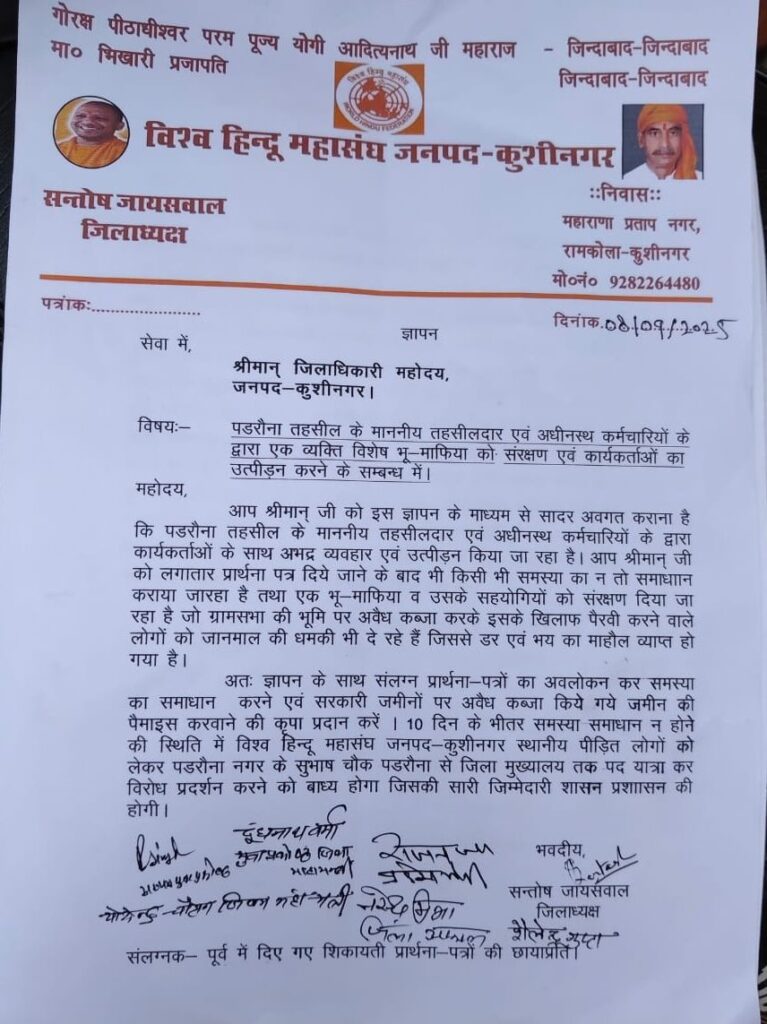 1. “पडरौना तहसील में उपेक्षात्मक रवैये से जनता त्रस्त, 10 दिन में समाधान न हुआ तो सड़क पर उतरेगा विश्व हिंदू महासंघ”